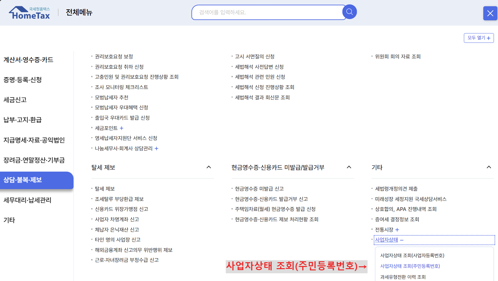 - 좌측 메뉴 [상담/불복/제보] > [사업자상태조회(주민등록번호)] 클릭